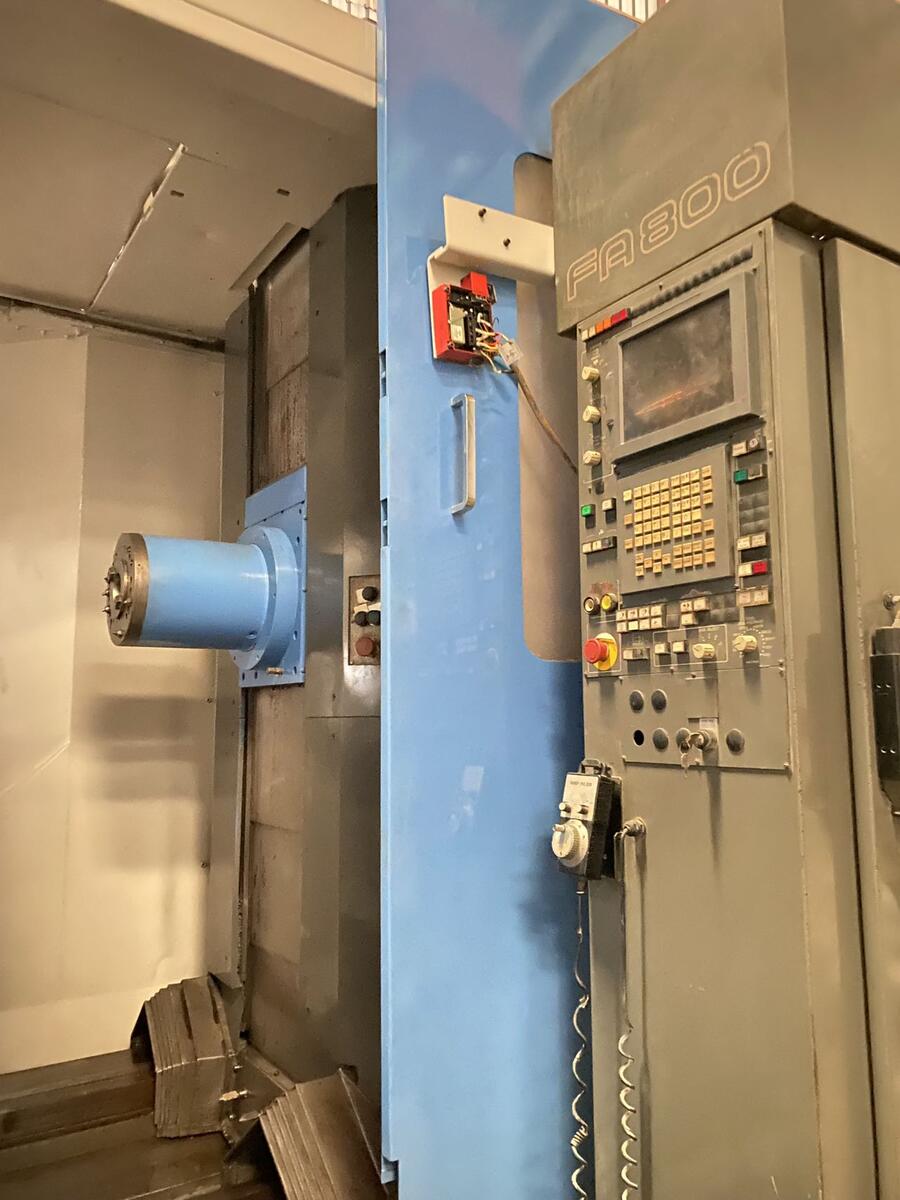 丰田工机FH800卧加!卓越的Y轴设计,采用双丝杆、双电机驱动,高刚性加工!发那科:16i-MB系统XYZ行程:1350,1150,1150工作台0.001分度BT50刀柄,90把刀具刀库工作台800*800,负载承重:2500KG主轴转速6000转,主轴功率:37KW主轴高压中心出水,三轴硬轨!