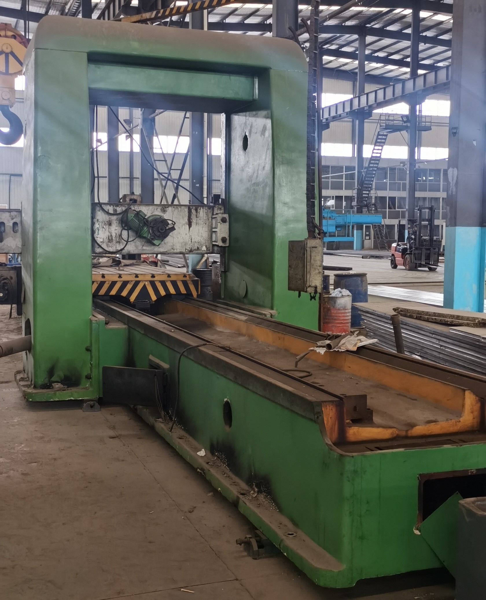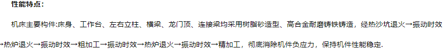 机床主要构件:床身、工作台、左右立柱、横梁、龙门顶、连接梁均采用树脂砂造型、高合金耐磨铸铁铸造,经热沙坑退火→振动时效→热炉退火→振动时效→粗加工→振动时效→热炉退火→振动时效→精加工,机件负应力,保持机件性能稳定.