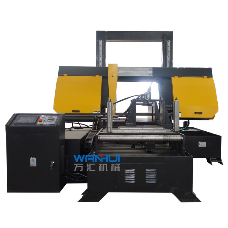 3. 在带锯床上装有二组虎钳,一组用来锯料时夹紧,自动送料由另外一组虎钳夹紧通过油缸工作来控制送料。送料长度由紫外线接紧行程开关控制,送料时由光栅尺自动检测数据控制.