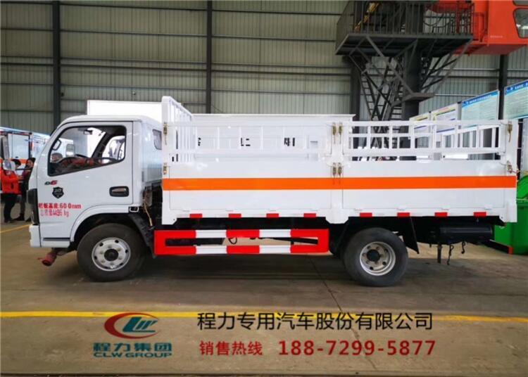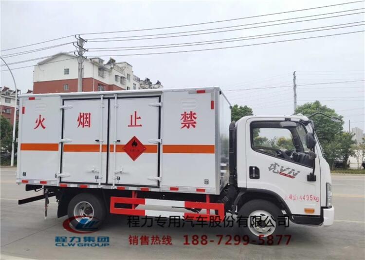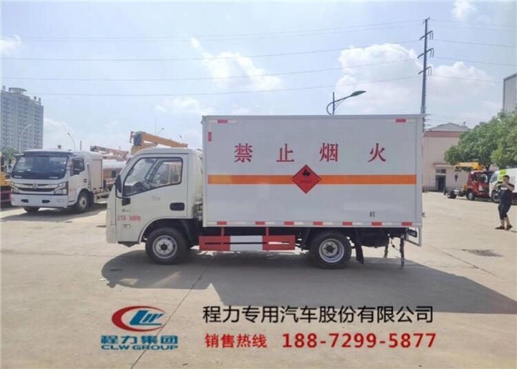 上装配置:严格按照公告尺寸制作,外板采用1mm厚冷轧板有一次性成型的百叶窗,内饰为导电性能良好的铝板有透气孔,内衬为矩形管骨架牢靠稳定,内部填充为透气防潮阻燃的挤塑板,四种材料经现代工艺复合而成,厢体外部上下铝合金型材包边,底板和车厢前下部铺橡胶皮,后门双开,右侧中部单开门,车辆外部有静电带、灭火器、防火罩,车厢内安装烟雾报警器和门防盗报警器,严格按照危险品相关法规张贴。