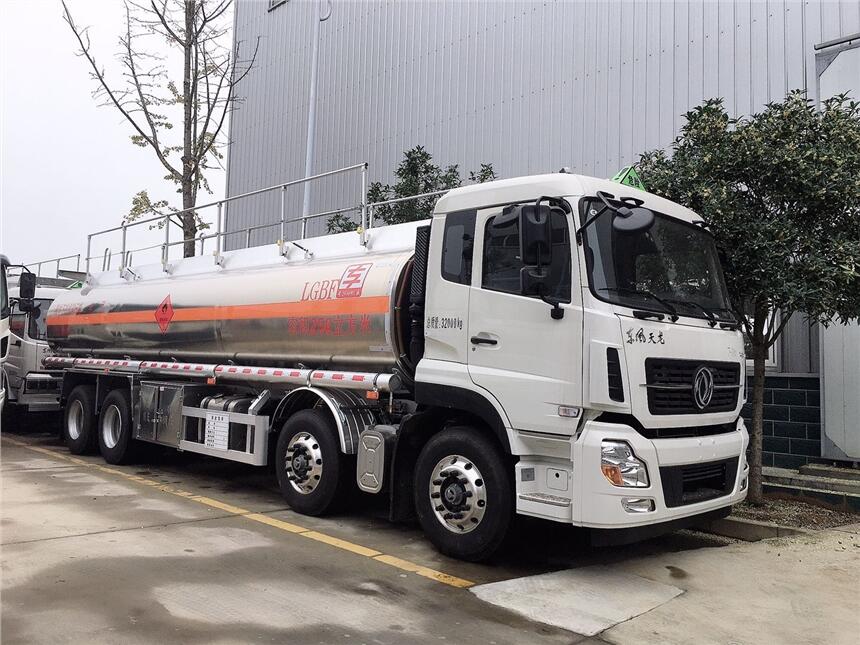 采用国五东风前四后八新规底盘,天龙平顶驾驶室,2050+4400+1350轴距,康明斯315马力,法士特9档变速箱,5T/10T前后桥,280X80X(8+4)大梁,295/80R22.5轮胎,400L油箱,排气管前置,前轮盘式制动,带ECU限速,带远程油门接口,ABS,空调,中控锁,电动玻璃,标准东风商用车危货底盘,上装配置:严格按照公告尺寸罐体27.5方制作,罐体厚度大于等于6MM,封头7MM,隔板5MM,采用5083铝合金材质,带一个专用油泵,2个欧标罐口,1个海底阀,1个下装油口,1套油气回收,1个放溢流探杆及静电插座,带折叠护栏,两根罐体等长输油管,两个灭火器。其余标配。