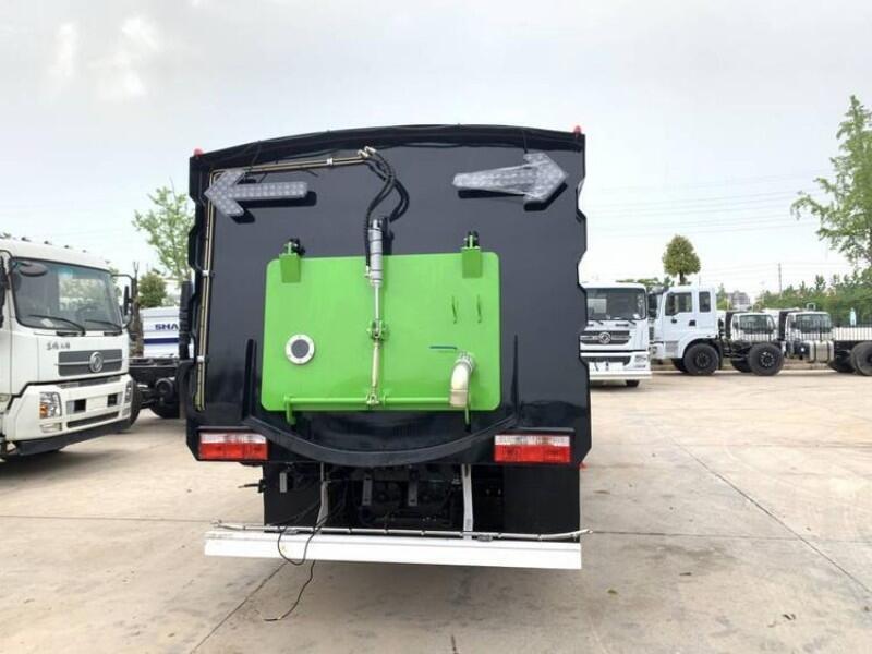 7. 垃圾箱采用双层内胆不锈钢结构,内部加装过滤网板,能有效地防止树叶、塑料袋之类的轻飘物堵塞风口及灰尘的排出。内置污水报警系统,通过后门处污水阀方便的将污水排至下水道,限度的利用了垃圾箱装载垃圾的空间。厢体采用倾翻卸料,带高压冲洗自洁装置。