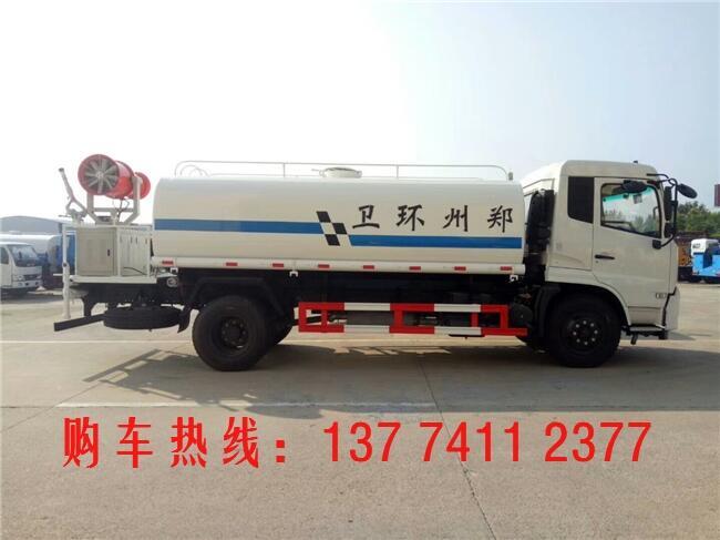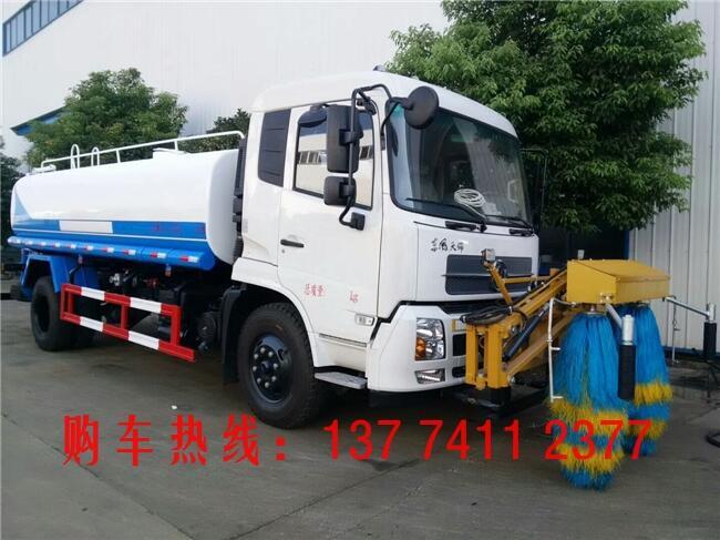 洒水车罐体材质为Q235国标碳钢,厚度为4MM,带大功率专用洒水泵,前冲、侧喷、后洒,带后工作平台和洒水高炮,高位花洒。