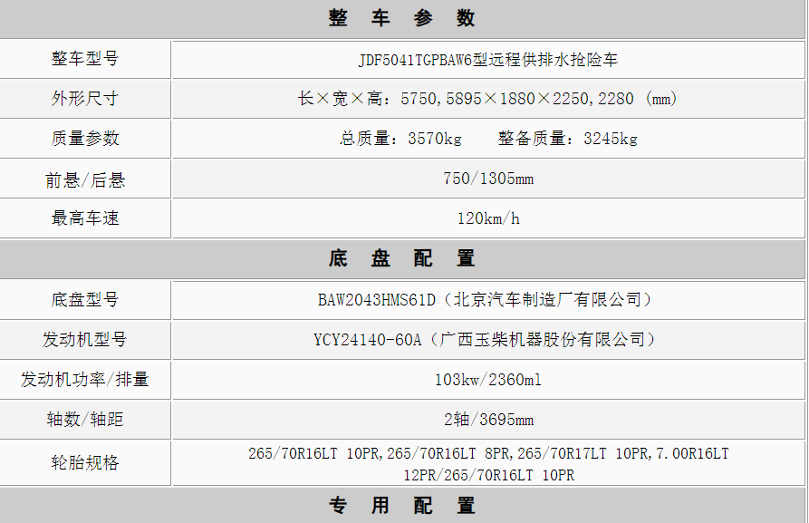 JDF5041TGPBAW6型远程供排水抢险车又叫勇士四驱越野远程供排水抢险车,该车采用BAW2043HMS61D越野底盘改装而成,主要专用装置有高压泵,用于应急供排水抢险作业。该车尾部安装照明灯只能在车辆切换作业状态才可开启,行驶状态不能开启。可根据用户选择不同的泵,以到达远程供水及灭火效果,具体详情请咨询:158 2678 7333(微信同号)