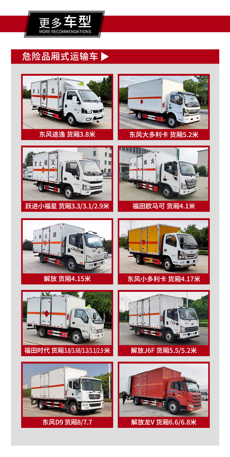 车厢体顶部封闭,不可开启;运输品名:感染性物质,诊断样品,医院诊断废弃物,有机毒性液体,有机毒性固体,类项号:6.2,6.2,6.2,6.1,6.1,轴距/后悬的关系为(mm):2600/1339,2800/1139;随底盘选装驾驶室以及驾驶室顶部导流罩;该车前轮安装盘式制动器,前置排气管,装配限速装置,限速80km/h;安装带有卫星定位功能的行驶记录仪;ABS型号及厂家:APG3550500A,浙江亚太机电股份有限公司,选装右侧开门,安装直接供电方式的ETC车载装置,整备质量对应的配件配备:润滑济,燃油箱(90%容量)等,扩展车宽(mm):1820。
