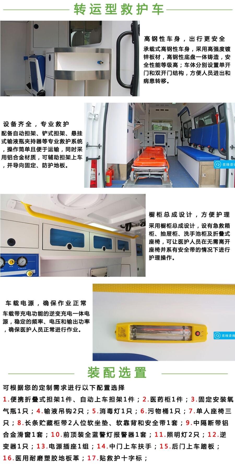 6 杀菌系统 1、紫外线消毒灯1个(灯丝采用高寿命冷阴极,杀菌有效空间可达 12 立方米,亦可带有延时熄灭功能)。国六新车型 两台福特新全顺V362救护车现车直销订金随时随车发车。