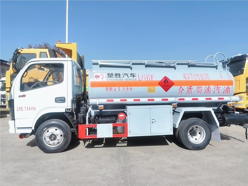上装配置:采用Q235优质碳钢板,公告容积4.5方,标配单仓带泵(可泵进泵出) , 带壹个欧标罐盖,壹个海底阀,带欧标全套下装油系统(含下装卸油阀、油气回收装置以及防溢流装置等), 预留加油机及卷盘位置,罐体顶部两侧带折叠式升降防护栏,随车配送两根输油软管,喷深灰色漆,贴"易燃液体"标识,其余均为厂家标配。
