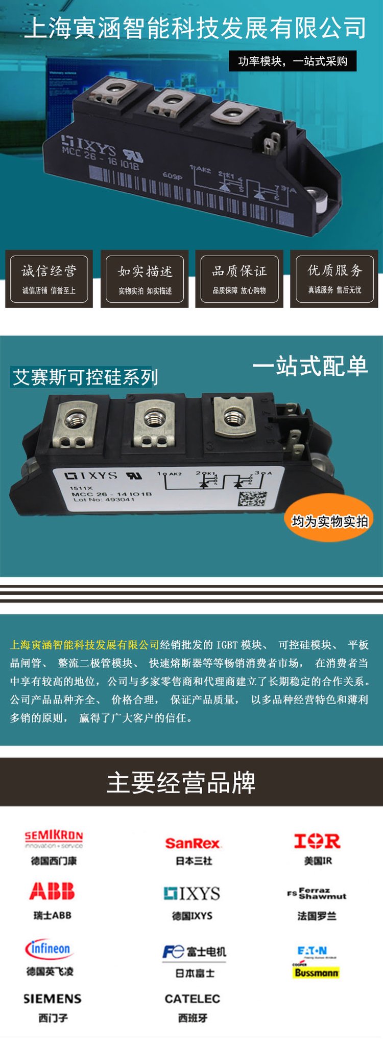以上就是MCC310-18IO1 艾赛斯IXYS可控硅 IGBT功率模块 库存 价格实惠新上产品,我公司提供巴斯曼Bussmann、英飞凌infineon、西门康、西门子Siemens、三社、艾赛斯、日之出、富士等厂家熔断器、可控硅晶闸管、IGBT模块、二极管整流桥的半岛体模块,欢迎来电咨询。