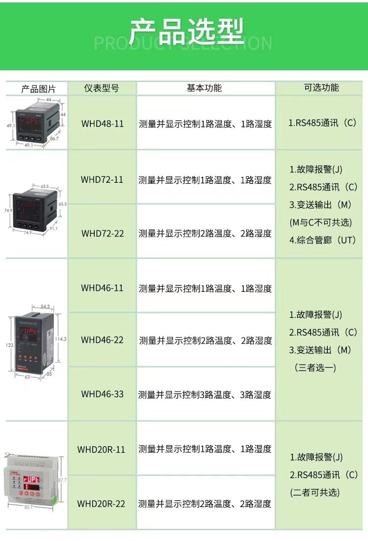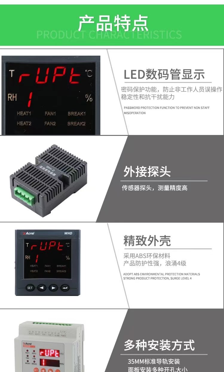 安科瑞WHD温湿度控制器产品主要用于中高压开关柜、端子箱、环网柜、变等设备内部温度和湿度的调节控制。可有效防止因低温、高温造成的设备故障以及受潮或结露引起的爬电、闪络事故的发生。智能型温湿度控制器以数码管方式显示温湿度值,有加热器、传感器故障指示、变送功能、带有RS485通讯接口可供远程监控,用户可通过按键编程自行设定系统参数。该仪表集测量、显示、控制及通讯于一体,精度高、测量范围宽,是一种适合于各个行业和领域的温湿度测量控制仪表。