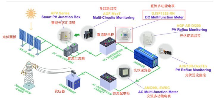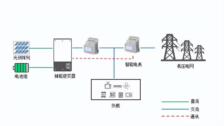 1. 对电能参数进行采样计量和监测,逆变器或者能量管理系统(EMS)与之进行通讯,根据实时功率及累计电能实现防逆流、调节发电量、电池充放电等功能;