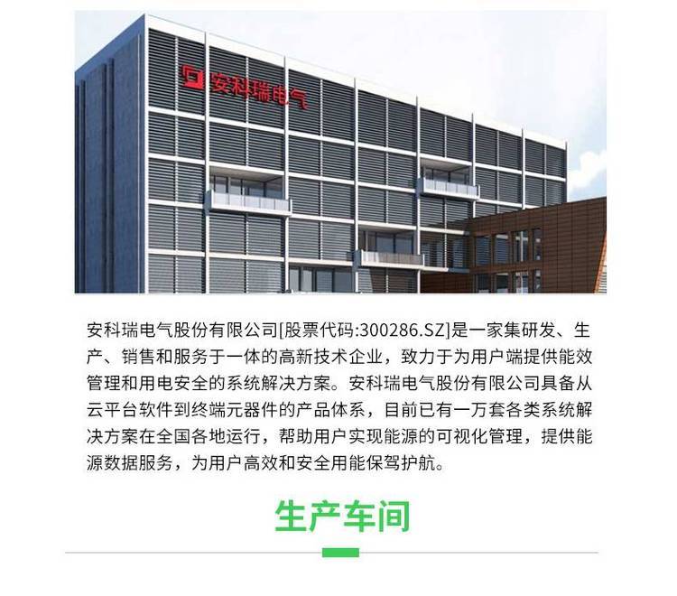 安科瑞电气股份有限公司(股票代码:300286)成立于2003年,是一家为企业提供能效系统和用电安全解决方案的高科技股份制企业。公司解决方案涵盖电力、环保、新能源、消防、数据中心、智能楼宇、智慧校园、智慧医院、智慧工厂、智慧交通、市政工程等多个领域。