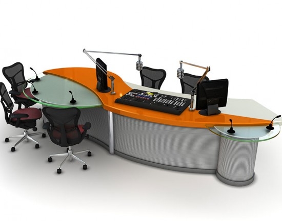 ●总体设计:标准型播音桌2.2米或2米4长部分产品为现货款,经典流线型设计,外形美观大方,符合人体工程学原理,符合光学要求,钢木组合结构,安装方便快捷,,也可根据演播室大小,量身设计订制。