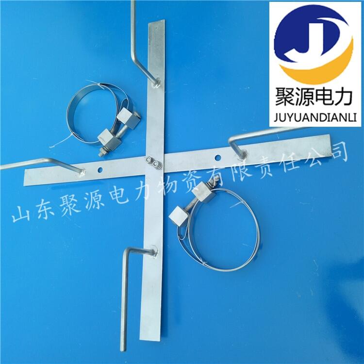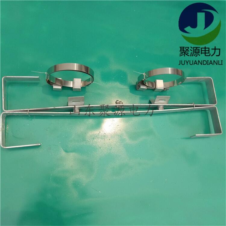 3、用钢带抱箍缠绕电杆,并用螺栓将余缆架紧固到钢带抱箍上,注意钢带要叠压,防止滑脱。