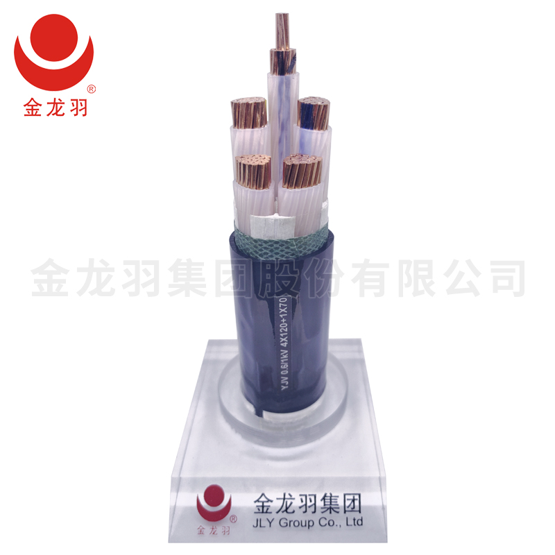 金龙羽集团股份有限公司生产的:金龙羽低烟无卤阻燃交联电缆,包括铜导体(1),铜导体(1)上设铜导体屏蔽层(2),铜导体屏蔽层(2)通过低烟无卤交联内绝缘层(3)连接阻燃玻璃纤维层(4),阻燃玻璃纤维层(4)上设铠装机械层(5),铠装机械层(5)上设阻水层(6),阻水层(6)上设低烟无卤交联外绝缘层(10),低烟无卤交联外绝缘层(10)外侧壁设纵向的凸条(7),低烟无卤交联外绝缘层(10)上设外护套(8),外护套(8)内壁设纵向的与凸条(7)吻合的凹槽(9)。本实用新型内外绝缘层材料采用一步法低烟无卤交联绝缘料,低烟无卤阻燃的特性更好,不会对环境造成二次危害,同时采用凹槽与凸条相配合提高交联电缆扭力。选择金龙羽电缆,通电有保障