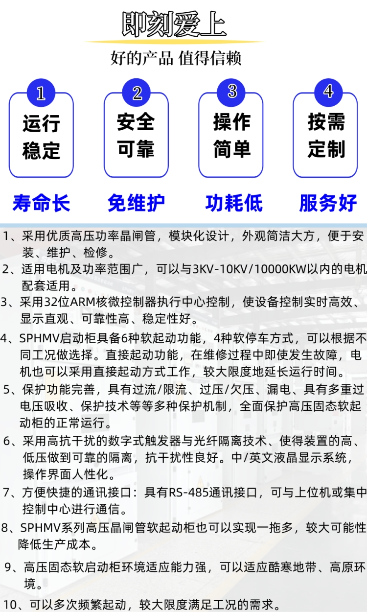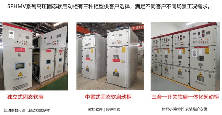SPHMV高压固态软启动柜是一种高压电机起动及保护设备,该装置采用多个可控硅串并连而成,可满足不同的电流及电压要求。其广泛应用于额定电压 3000—15000V 的水利泵站、建材、化工、冶金钢铁、造纸、环保等行业。能很好地与冰机、水泵、风机、压缩机、粉碎机、搅拌机、磨浆机、皮带机等各种机电设备配套使用。
