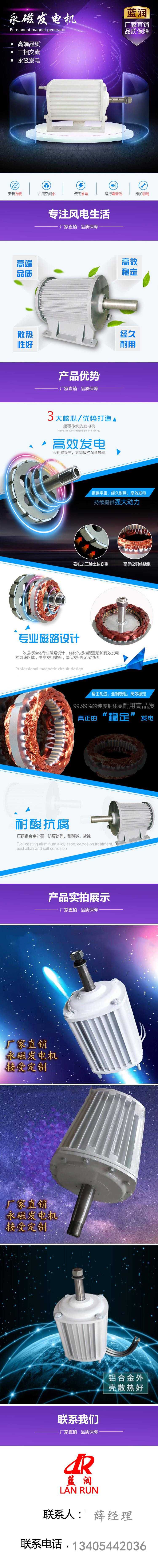 传统的火力发电对空气的污染已经使得地球不堪重负,生态环境的日益恶化催生着新型风力发电的发展,近年来发展起来的永磁发电机成为风力发电的佼佼者,因其效率高,功率因素高,直驱启动力矩小等优点成了其很多公司投入的重点。我公司生产的永磁风力发电机目前在国内外属于领先水平,结构可分为水平轴发电机和垂直轴发电机。