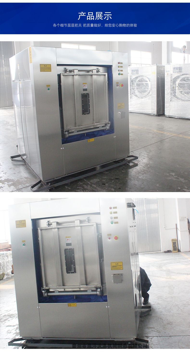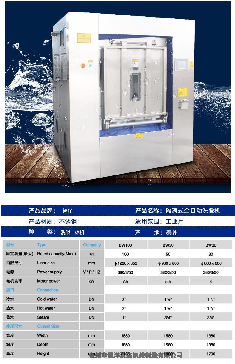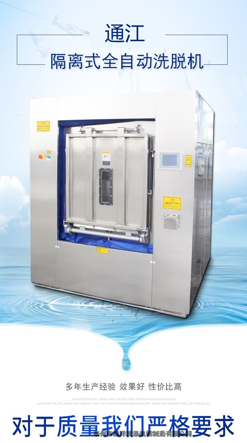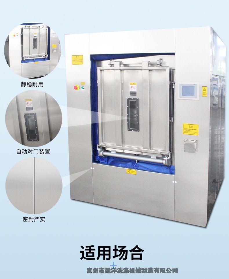 100kg医院双门双扉隔离式洗衣机,适用于医院洗衣房使用,洗涤医院布草,手术服,工作服,病人服装等,消毒杀菌洗涤,带脱水功能,全机采用304不锈钢制作,经久耐用,PLC控制器自动控制,变频悬浮式洗脱机,前后双门设计,前门进料,后门出料,达到卫生隔离效果。