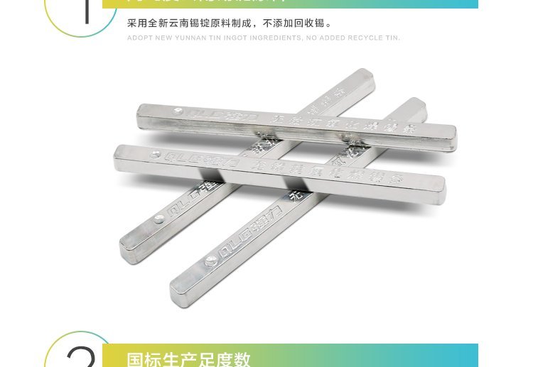 本款产品为:无铅环保耐高温焊锡条。可以适应锡炉温度至450摄氏度,有很强的高抗氧化性能,大大减少锡渣的产生,适用于小变压器引脚、漆包线等上锡。