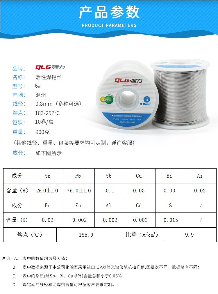 强力6#焊锡丝 含锡25线径0.8 1.0-2.3mm 900g/卷 松香芯经济型号 品牌 | QLG强力 | ||