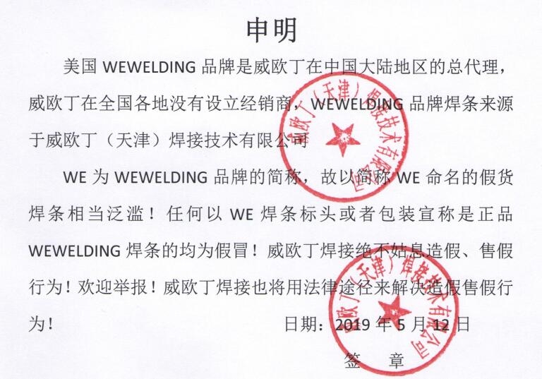 美国WEWELDING品牌是威欧丁在中国地区的总代理,威欧丁在中国各地没有设立经销商,WEWELDING品牌焊条来源于威欧丁(天津)焊接技术有限公司