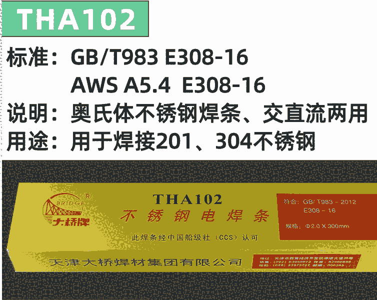 说明:THA102是钛钙型药皮的Cr19Ni10不锈钢焊条。熔敷金属具有良好的力学性能及抗晶间腐蚀性能。有优良的焊接工艺性能和抗气孔性能,药皮耐发红、抗开裂。可交直流两用。
