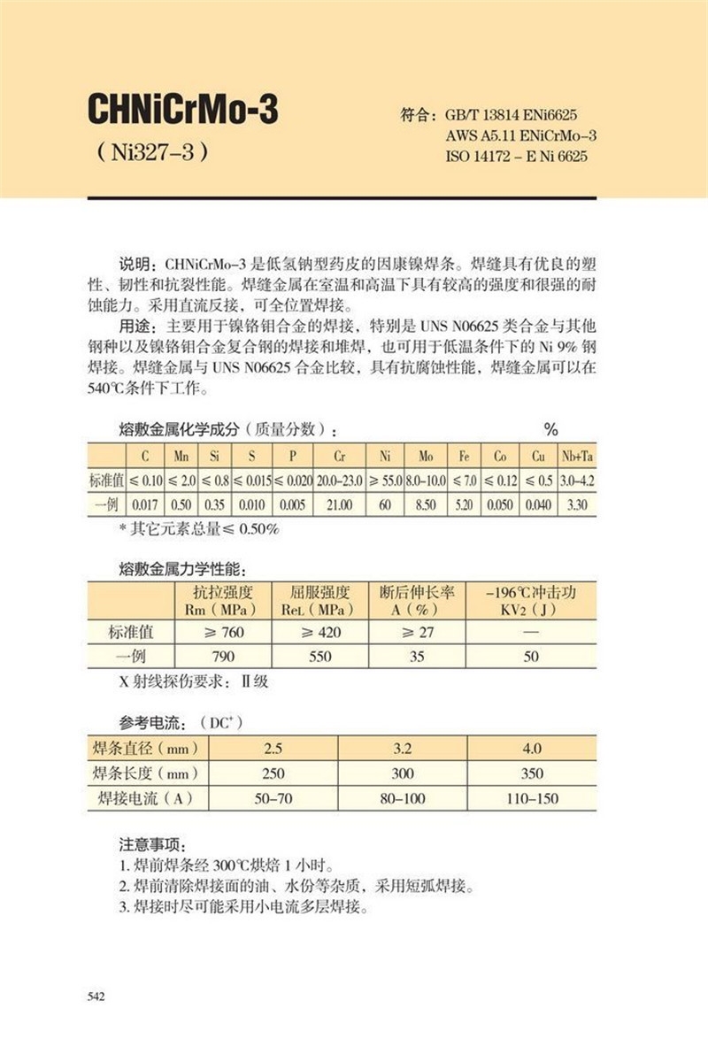 Ni337镍及镍合金焊条 型号GB/T:ENiCrMo-0 相当于AWS: ENiCrMo-0说明:低氢型镍铬耐热耐蚀合金焊条,焊缝金属中有适量的钼、铌等合金元素,具有较好的抗裂性及耐蚀、耐磨性,焊接工艺良好,采用直流反接。可全位置焊。用途:用于核反应堆压力容器密封面堆焊及塔内构件焊接,也可用于复合钢、异种钢以及相同类型的镍基合金焊接。