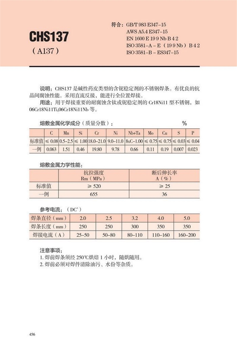 大西洋 CHS137 不锈钢焊条 E347-15 不锈钢焊条低氢型含铌Cr19Ni10Nb不锈钢焊条,具有优良的抗裂性及晶间腐蚀性,采用直流反接,可全位置焊。用于重要的耐腐蚀含钛稳定化元素的0Cr19Ni11Ti不锈钢。四川大西洋 CHS022 焊条 E316L-16 不锈钢焊条 A022电焊条A022 E316L-16铬钢通常为改善耐蚀性及可焊性而加适量的稳定化元素钛、铌、钼,可焊性较铬13钢为好,可采用同类型的铬不锈纲焊条(CHK302、CHK307)焊接。焊前,焊件应进行200℃左右预热,焊后进行800℃左右的回火处理。也可采用铬镍不锈钢焊条(如CHS107、CHS207),焊后不进行热处理。E316L-16 钛钙型的碳Cr18Ni12Mo2不锈钢焊条,具有良好的耐热、耐腐蚀及抗裂性,可直交流两用,工艺性能好。用于尿素、合成纤维等设备及相同类型的不锈钢,也用于焊后不热处理的鉻不锈钢、复合钢和异种钢等
