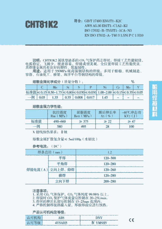 说明:CHT81K2属钛型渣系的CO2气保焊药芯焊丝,焊接工艺性能较佳,电弧稳定,飞溅少,脱渣容易,焊缝成型美观,全位置焊接工艺性能优良,其焊缝金属具有良好的塑性,低温韧性。