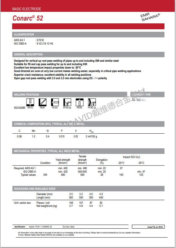 Conarc 52 焊接电极附有材料证书。收到货物后,该信息将通过电子邮件发送。