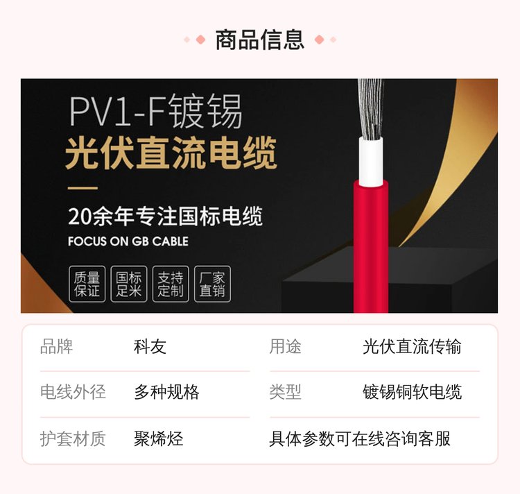 PV1-F镀锡光伏直流电缆太阳能阻燃单芯电缆线安全传输