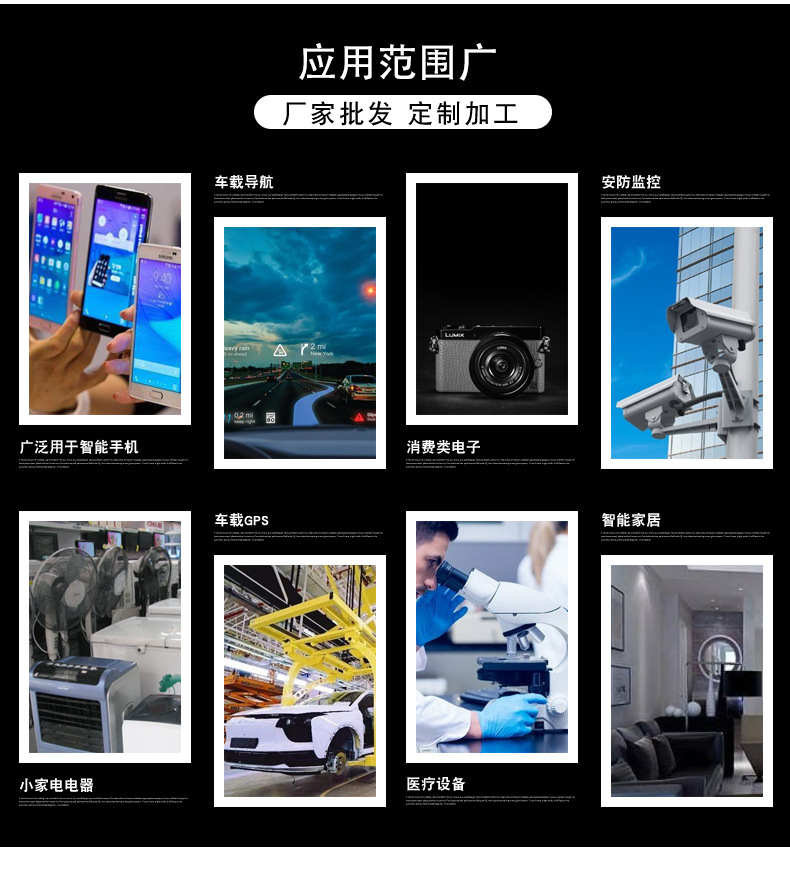 应用领域 | 泛用于智能手机 、小家电电器 、车载导航 、车载GPS 、消费类电子 、医疗设备、 安防监控 、智能家居、智能 | ||