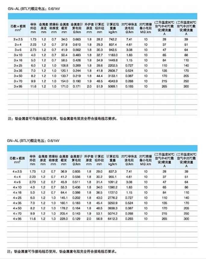 矿物质绝缘电缆NG-A(BTLY)规格如下: