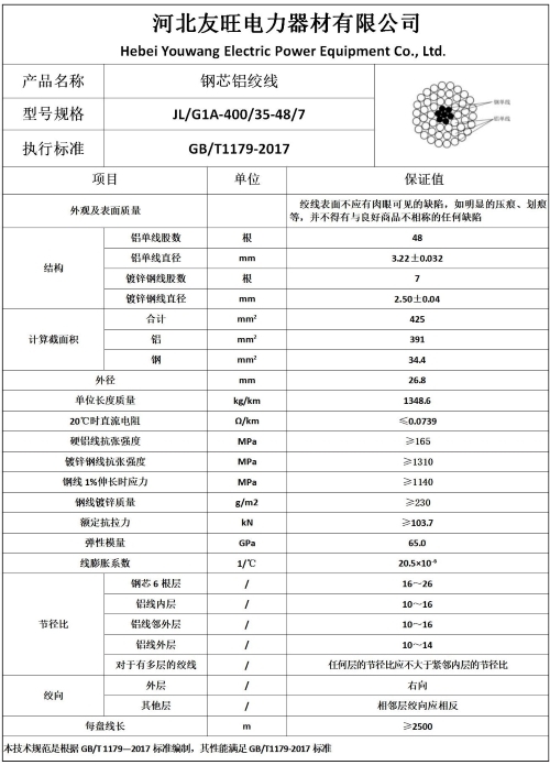 四、JL/G1A-400/35钢芯铝绞线厂家产品基本参数及样本图片: