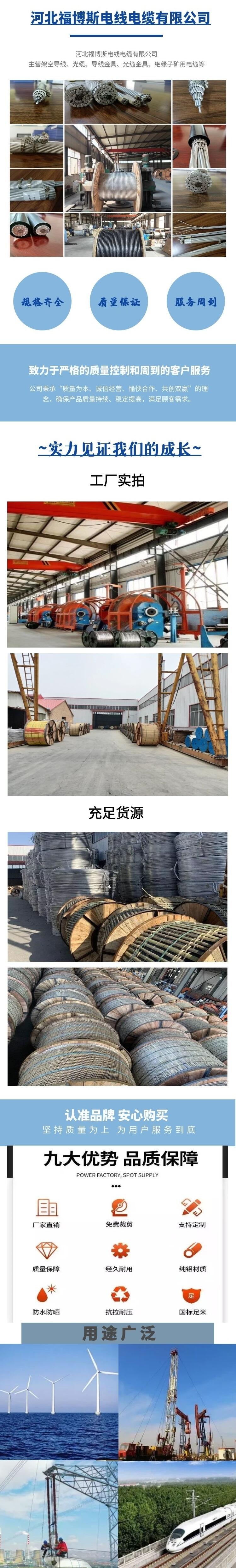 钢芯铝绞线具拉强度、塔杆距离可放大等特点。因此广泛应用于各种电压等级的架空输配电线路中有结构简单、架设与维修方便、线路造价低传输容量大距离长,又利于跨越江河、山谷等特殊地理条件的架设;具有良好的导电性能和足够的机械强度抗。