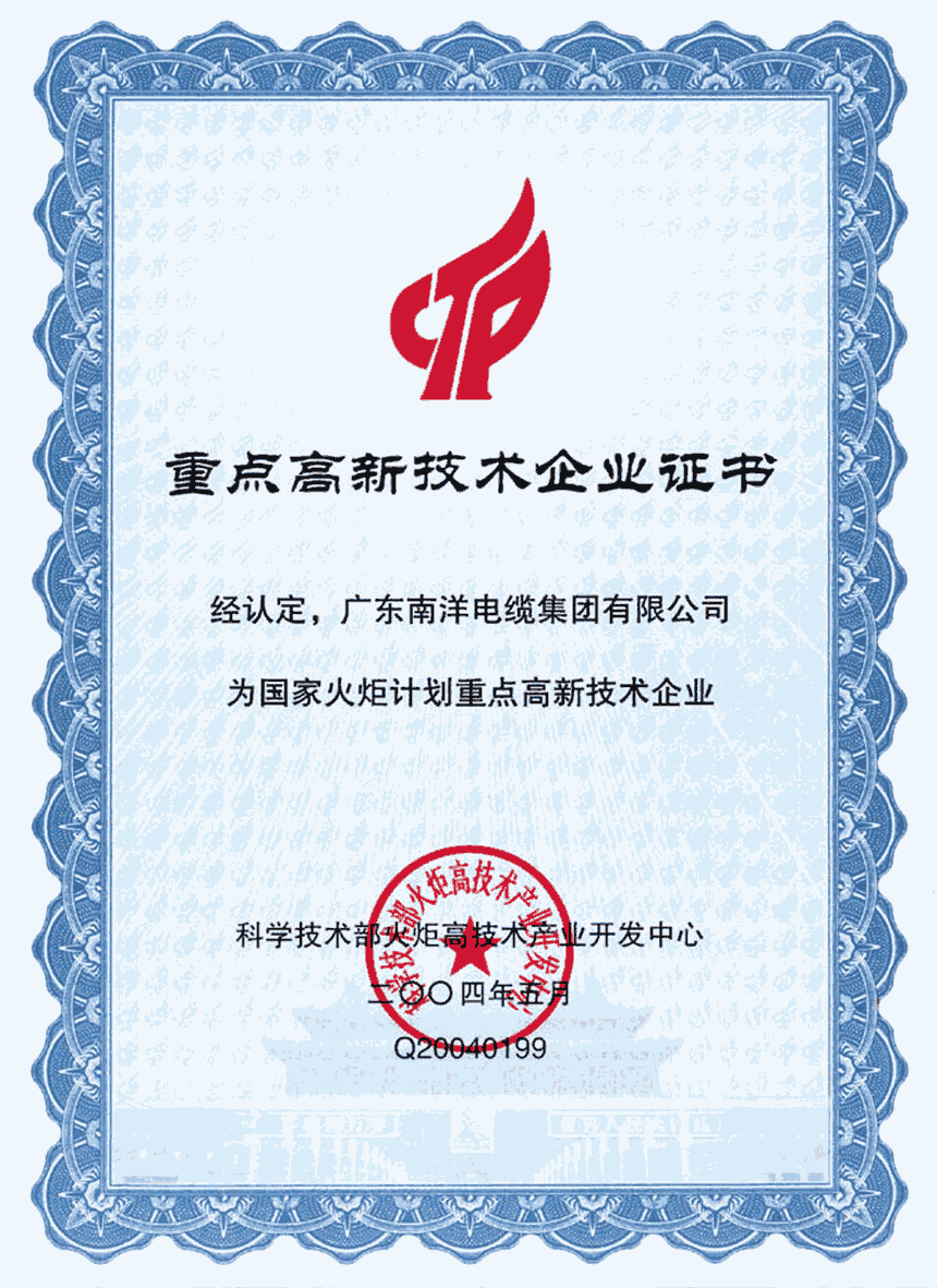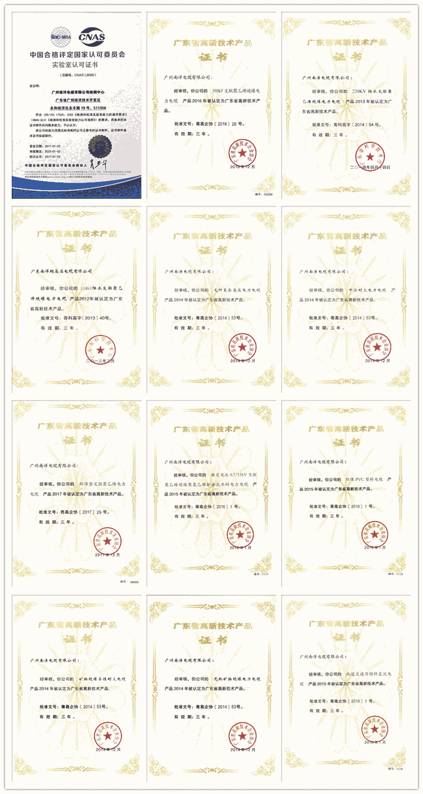 公司是通过ISO质量管理体系、环境管理体系、职业健康安全管理体系、测量管理体系认证的企业,是全国电线电缆标准化技术委员会委员单位、广东省电线电缆行业协会会长单位。35kV及以下电缆产品获得全国工业产品生产许可证,电线产品通过中国质量认证中心CCC认证, 6~35kV、110kV、220kV、500kV电缆通过产品鉴定,220kV及500kV电缆系统通过预鉴定试验和荷兰凯马(KEMA)认证,500kV电缆系统填补了华南地区空白。0.6/1kV、6~35kV、110kV、220kV电缆产品均被评为广东省名牌产品、广东省高新技术产品。公司连续多年被评为“守合同重信用企业”单位,银行信用等级为AAA级;拥有广东省工程技术研究开发中心、省级企业技术中心、广东省超高压电缆工程技术研究中心,拥有多项专利并多次参与国家标准及行业标准的制定,不断创新开发新产品。