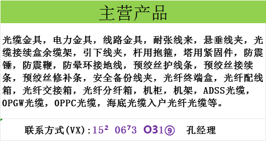 ADSS/OPGW光缆,光缆金具,电力金具,线路金具,耐张线夹,悬垂线夹,光缆接续盒,余缆架,引下线夹,杆用抱箍,塔用紧固件,防震锤,防震鞭,防晕环,接地线,预绞丝护线条,预绞丝接续条,预绞丝修补条,安全备份线夹,光纤终端盒,光纤配线箱,光纤交接箱,光纤分纤箱,机柜,机架,ADSS光缆,OPGW光缆,OPPC光缆,海底光缆,室内光缆光纤等。
