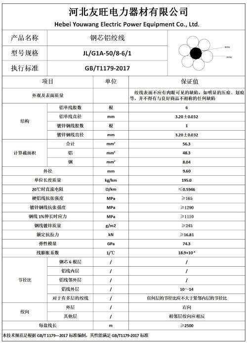 四、国标钢芯铝绞线JL/G1A50/8现货供应产品基本参数及样本图片: