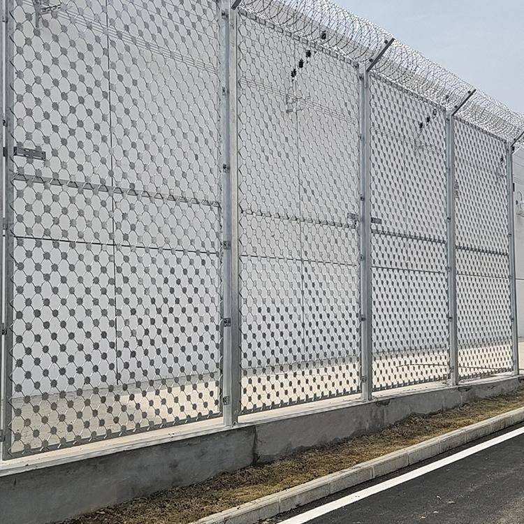 梅花护栏网立柱采用Y型镀锌钢管:壁厚150*150*8mm /网片边框60*60*2.5m、Y型立柱安装不锈钢刀片刺网。