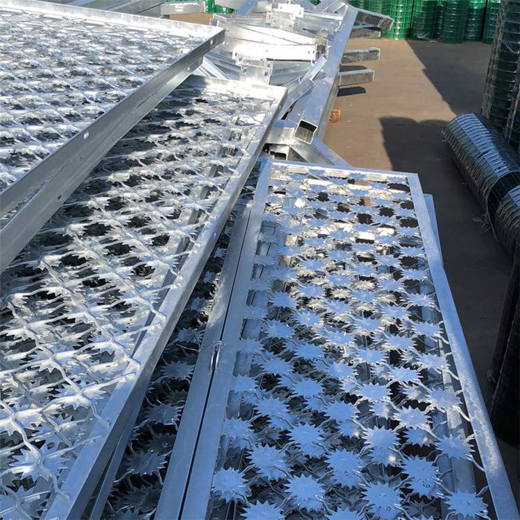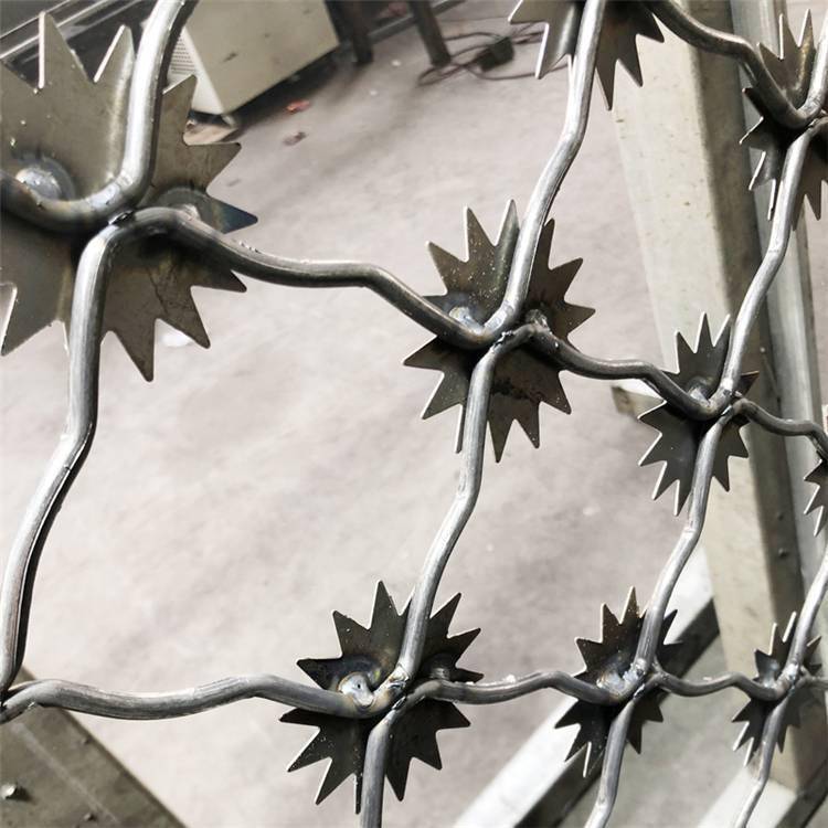 ? ?梅花刺片 护栏网是由V型支架立柱 型焊接片网,安全防盗连接件和热镀锌刀片刺笼组成强度和安全防御性级别很高。