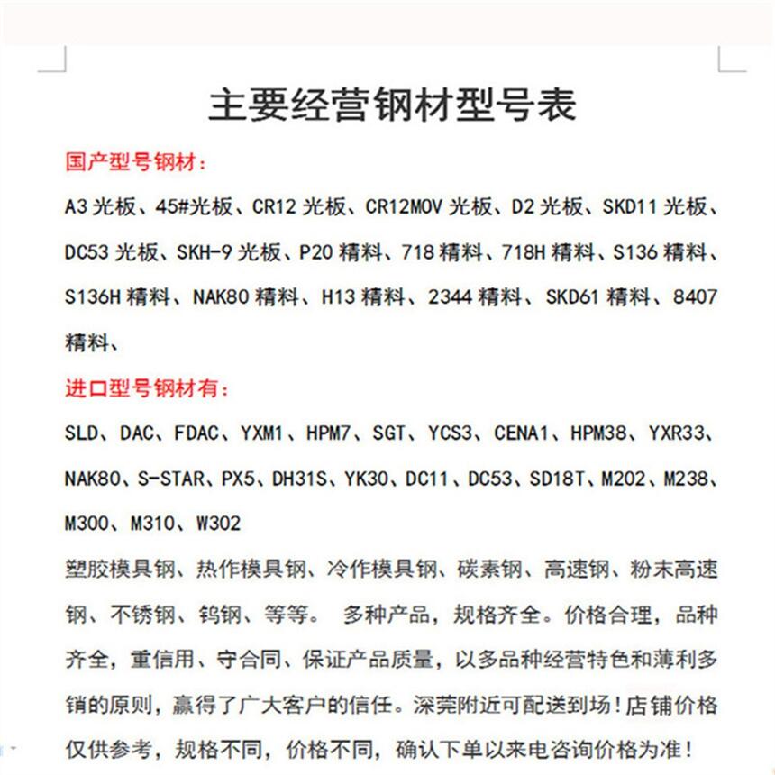 友 情提示:由于市场瞬息万变,模具钢材价格波动濒繁,价格如有变动恕不另行通知,以当天报价为准,可按客户要求尺寸开锯,按实际重量称重(光板/精板可按理 论计重).运费将按实际情况做调整不便之处敬请谅解,如需要13%票.请来电咨询为了满足广大客户的需求,我司提供24小时在线服务.随时欢迎您的来电,【宝逸金属】随时保持与您的合作!