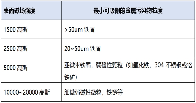 如上的磁场强度是指在此强度下,此类金属污染物直接贴近时可以吸附情况,若是物料与强磁棒有一定的间距(如超过1cm),则需要更高的磁场强度。
