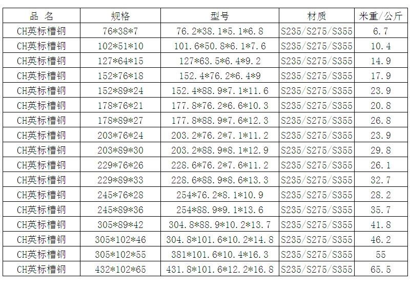 在相同的高度下,轻型槽钢比普通槽钢的腿窄、腰薄、重量轻。18 ―40 号为大型槽钢,5 ―16 号槽钢为中型槽钢。进口槽钢标明实际规格尺寸及相关标准。槽钢的进出口定货一般是在确定相应的碳结钢(或低合金钢)钢号后,以使用中所要求的规格为主。除了规格号以外,槽钢没有特定的成分和性能系列。