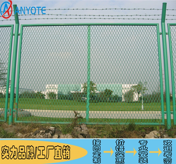 而成的护栏网产品。我公司生产的机场护栏网采用低碳钢丝焊接而成的网片、;立柱、刺铁丝、斜撑连接而成。本产品具有美观、大方、防腐性等