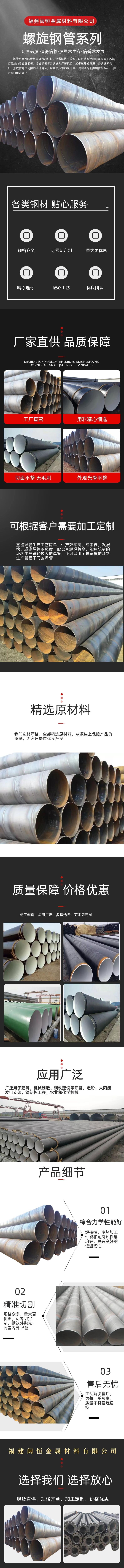 本厂位于福建省福州市青口、长乐钢材市场内,交通十分便利,拥有二条双面埋弧焊螺旋钢管生产线,可生产钢管直径219mm-3420mm, 壁厚3mm-28mm,单支长度可生产1m-35m的钢管,采用进口美国林肯焊机全自动双面埋弧焊机焊接,严格按照标准GB/T9711和SY/T5037进行生产,生产工艺科学合理,检测设备先进齐全,人力技术力量雄厚,年产量4万余吨,产品的质量优良,规格齐全。 本产品用于电力、石油、化工、热力、打井、污水、自来水、打桩、钢结构、钢护筒、通风等工程建设行业。 公司坚持“诚信经营,力求多赢”的市场运作理念,正确的经营思路,给公司带来了良好的经济效益,为网络化营销打下了良好的基础。秉持务实进取的浩博精神,更期待与广大用户共享辉煌未来!联系我们:15659991960