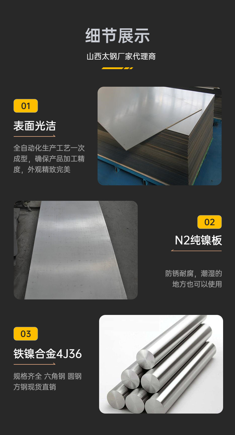 广东江苏4J36/Invar3殷钢光圆棒·冷轧板····产品生产厂家:我们与山西太钢、上海宝钢、张家港浦项、昆山大庚、广州联众、东北特钢、宝新、等国内知名钢厂建立了良好的合作代理关系,是国内外化工装备、航空制造、电厂脱硫脱硝、石油、造纸、海水淡化、核能、氯碱、造船以及板式换热器、波纹管等行业重要的特种金属材料供应商。镍合金,是以镍为基加入其他元素组成的合金。1905年前后制出的含铜约30%的蒙乃尔(Monel)合金,是较早的镍合金。镍具有良好的力学、物理和化学性能,添加适宜的元素可提高它的抗氧化性、耐蚀性、高温强度和改善某些物理性能。镍合金可作为电子管用材料、精密合金(磁性合金、精密电阻合金、电热合金等)、镍基高温合金以及镍基耐蚀合金和形状记忆合金等。在能源开发、化工、电子、航海、航空和航天等部门中,镍合金都有广泛用途。 [1]
