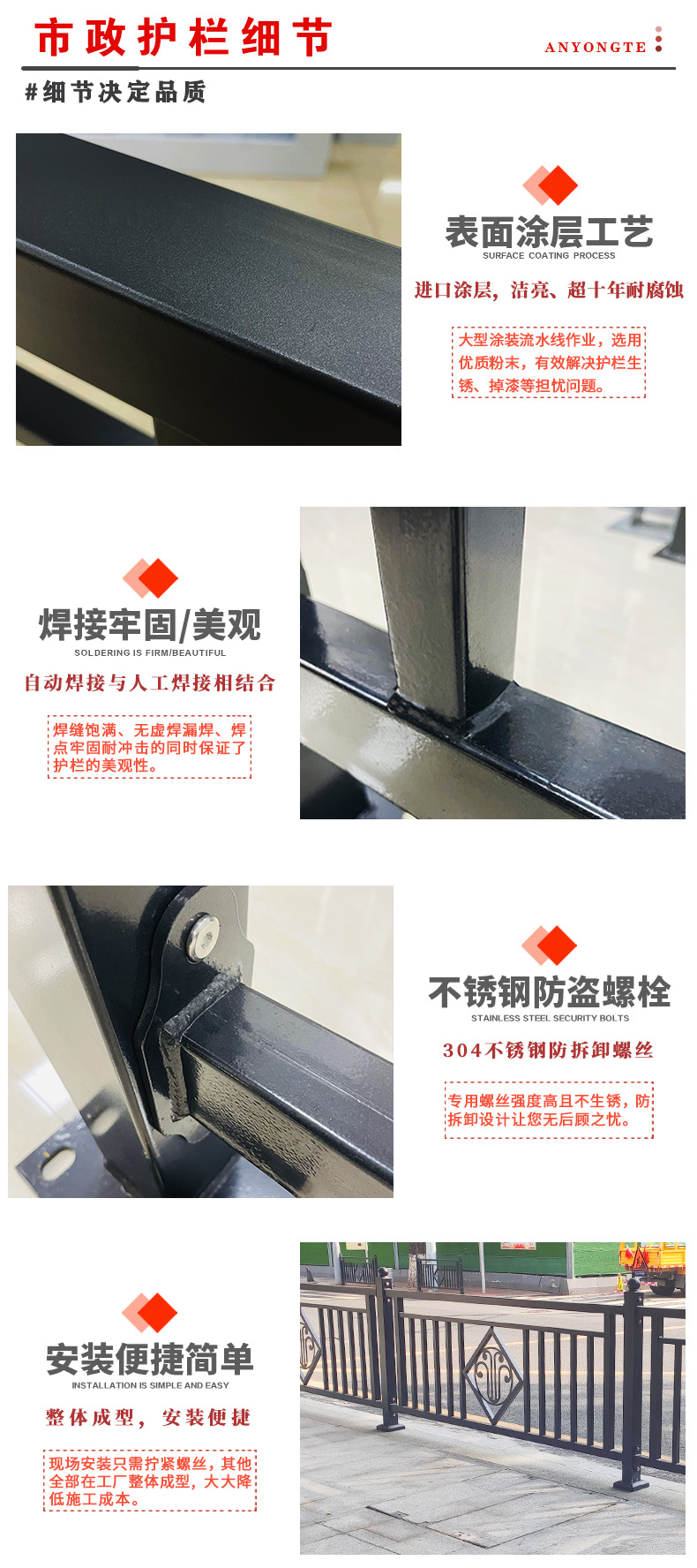 产品广泛使用于市政工程,道路,工厂,开发区,园林广场等场所的安全防护及装饰美化;还可用于小区、庭院、别墅,其线条流畅、简洁美观、富有浓郁的现代气息,让小区生色,让庭院生辉,让别墅具有时代的高品位。;其产品造型美观,而且牢固,防腐性好,安装简单、维修方便、容易清洗、经济实用,免除维修,结构美观,与环境协调性好。是美化城市环境工程的产品!