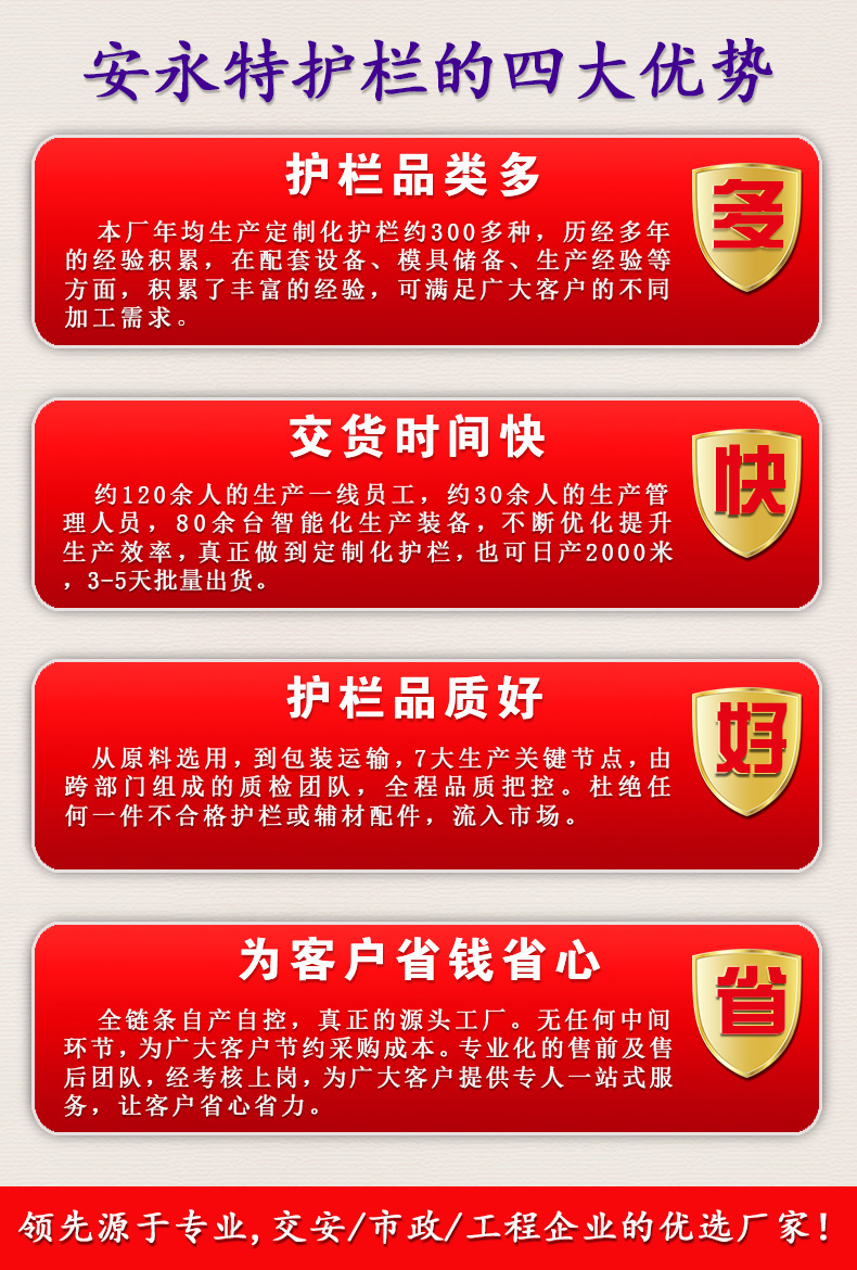 深标2型材料材质为Q235碳素钢,材料有20*20方管、80*80方管、10厘钢板、50*10扁铁,护栏片与立柱连接为M12*50六角螺栓,在端头、双向迎车面根据需要可贴上白反光膜,每6米一块反光膜。根据安装方式,如需要底座固定的,一般为铸铁底座400*400*100mm,底座重量30kg每个。