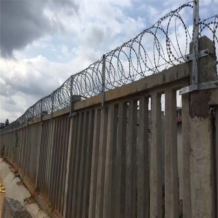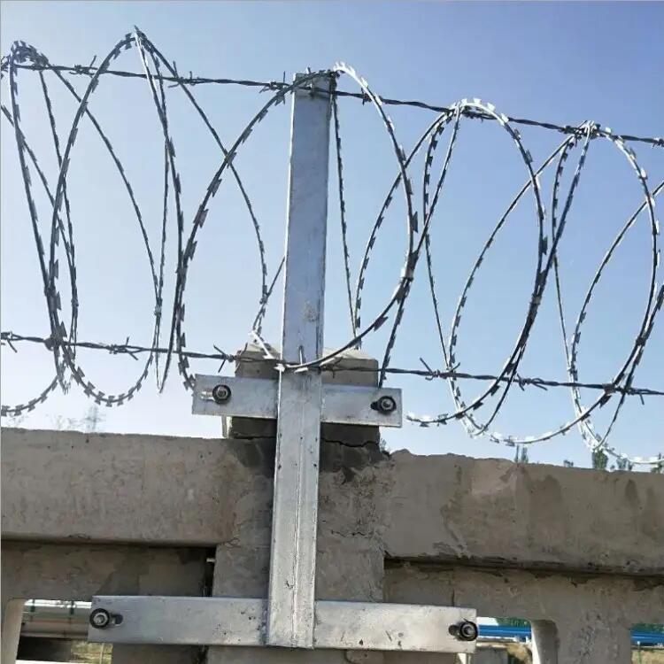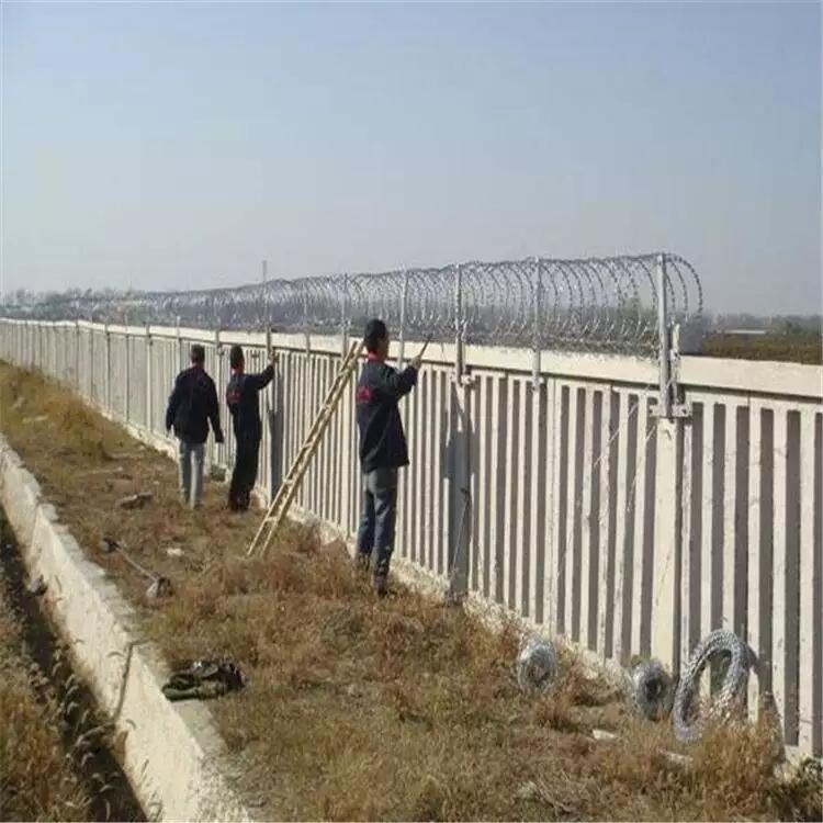 铁路上面用的刺丝滚笼是直径500毫米的,拉开间距为20公分,0.5m丝资龙支架和加密支架采用30*50*2.0短形钢管制作,表面进行热镀锌处理,镀锌量270g/。纵向拉筋两道,后安装刀刺滚笼,通过卡扣连接在纵向拉筋上,从而形成高铁防护栅栏加高刺丝滚笼成品。