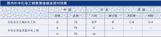 电工钢的表面涂层是一种能提高电磁性能、减少涡流损失,且有一定张力满而均匀的绝缘涂层。另外,在制造电机和变压铁芯时,要将电工钢板冲剪成坯料,再通过氩弧焊和热铸铝将叠好的一定数量的芯片边缘固定,因此,不仅要求电工钢具有良好的绝缘性和较高的层间电阻,而且需要有良好的冲片性、附着性、焊接性、能经受消除应力退火。宝钢现有的钢带绝缘涂层的种类及其特征如下: