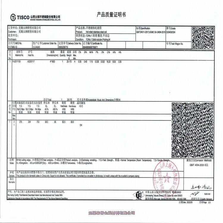 ??公司主要经营品种有:、S30408、S30403 S30409 S32168? S32169 S31608 S31668 S31603 316Ti S31008 321H S31803 S32205 S322053 400系、200系、?904L,2205、2304等双相不锈钢及800H、600H等高镍合金,货源充足,常备库存>5000余吨。并可为需要特种钢、特殊规格的客户代理订货。?????????????? 我司具备专业市场分析团队,密切关注不锈钢原材料价格波动、不锈钢制造商的生产信息及市场的需求信息,并通过高达系统对用户进行分类销售,满足不同细分市场客户的需求。同时我们为客户提供专业的技术咨询服务,深化客户对不锈钢的认识,加强客户与钢厂之间的联系。对客户的特殊需求,建立与钢厂新品种开发部门的长效合作机制,充分与客户实现深度沟通,并可为客户代理货物配送业务。